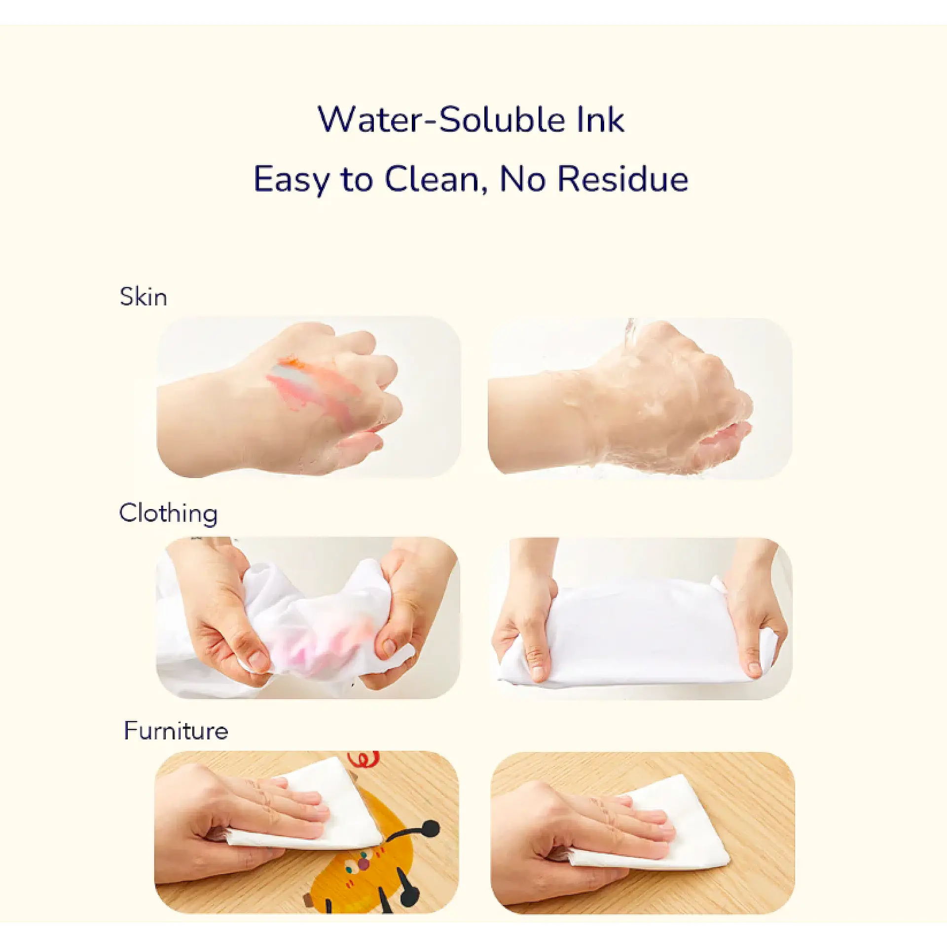 💧 الحبر قابل للغسل، مما يسهّل التنظيف ويجعلها مثالية للاستخدام اليومي بدون قلق.