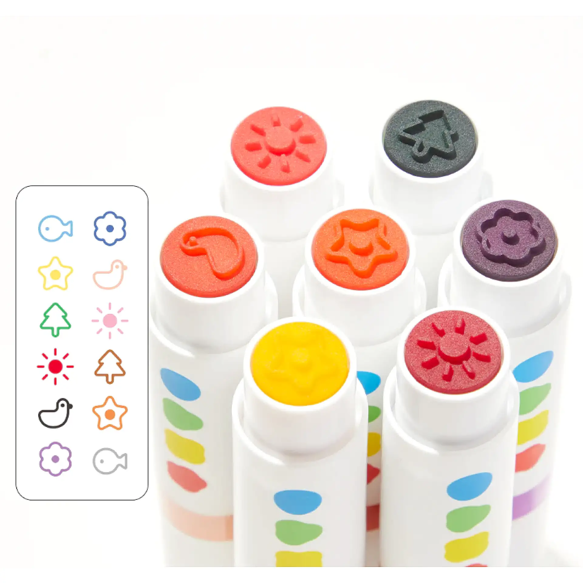 🖌️ كل قلم يحتوي على ختم دائري في الطرف، يتيح للطفل إنشاء نقاط، أشكال ونقوش بسهولة ومتعة.