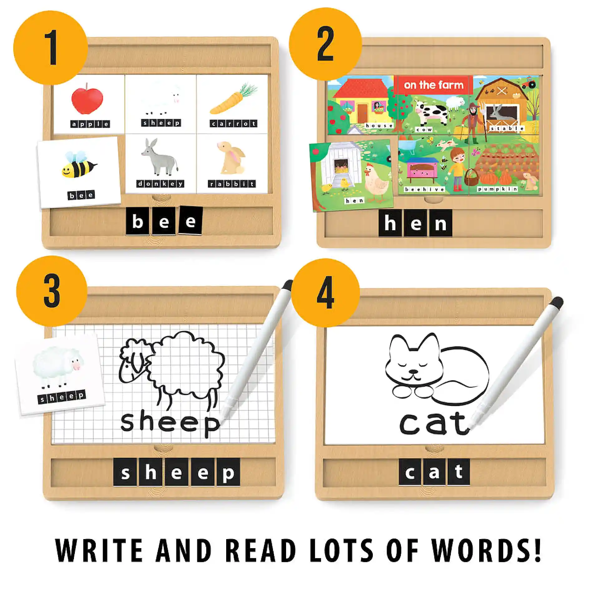 اللعبة تسمح للطفل بتكوين كلمات باستخدام حروف، ثم كتابتها باستخدام قلم خاص، مما يعزز تعلم القراءة والكتابة والمفردات