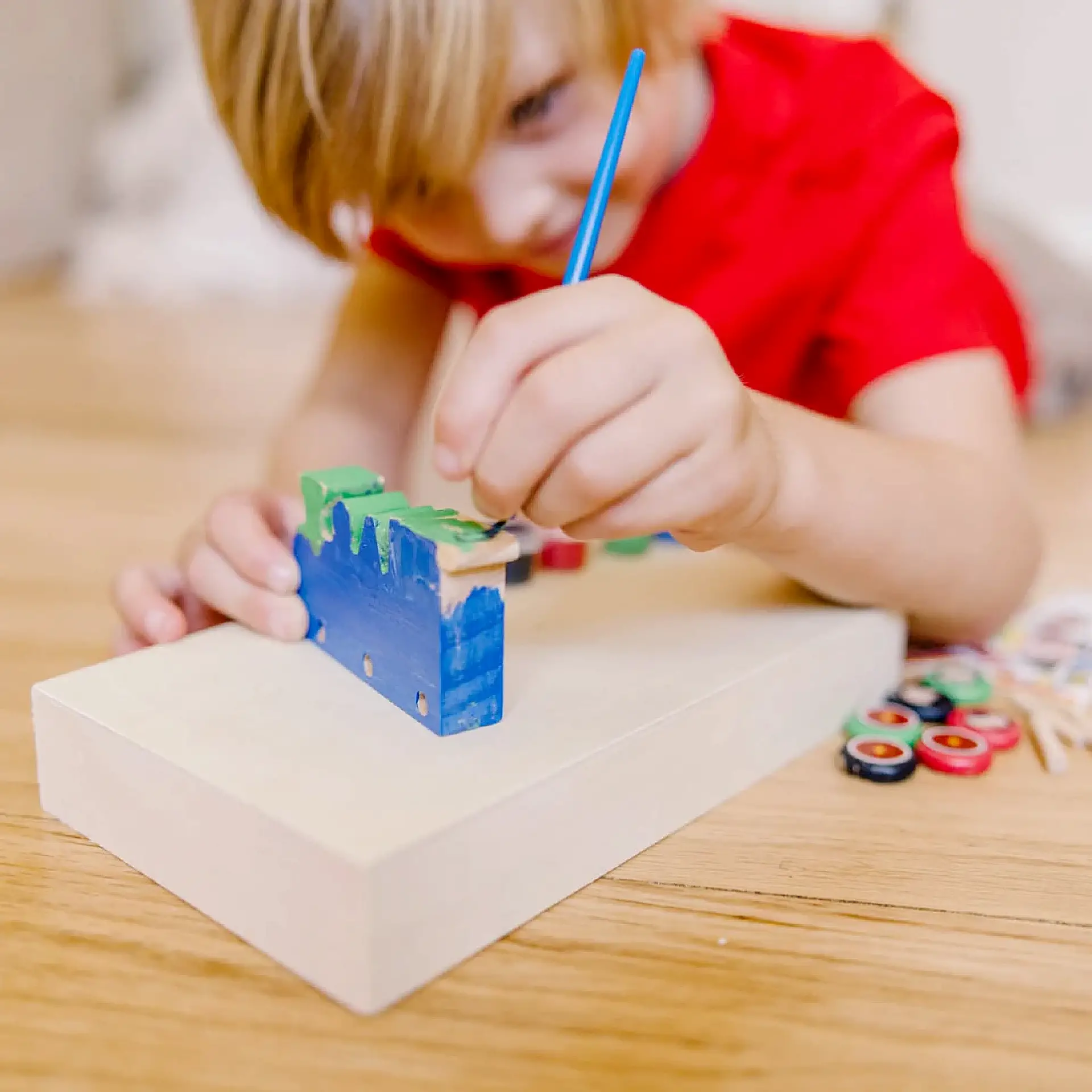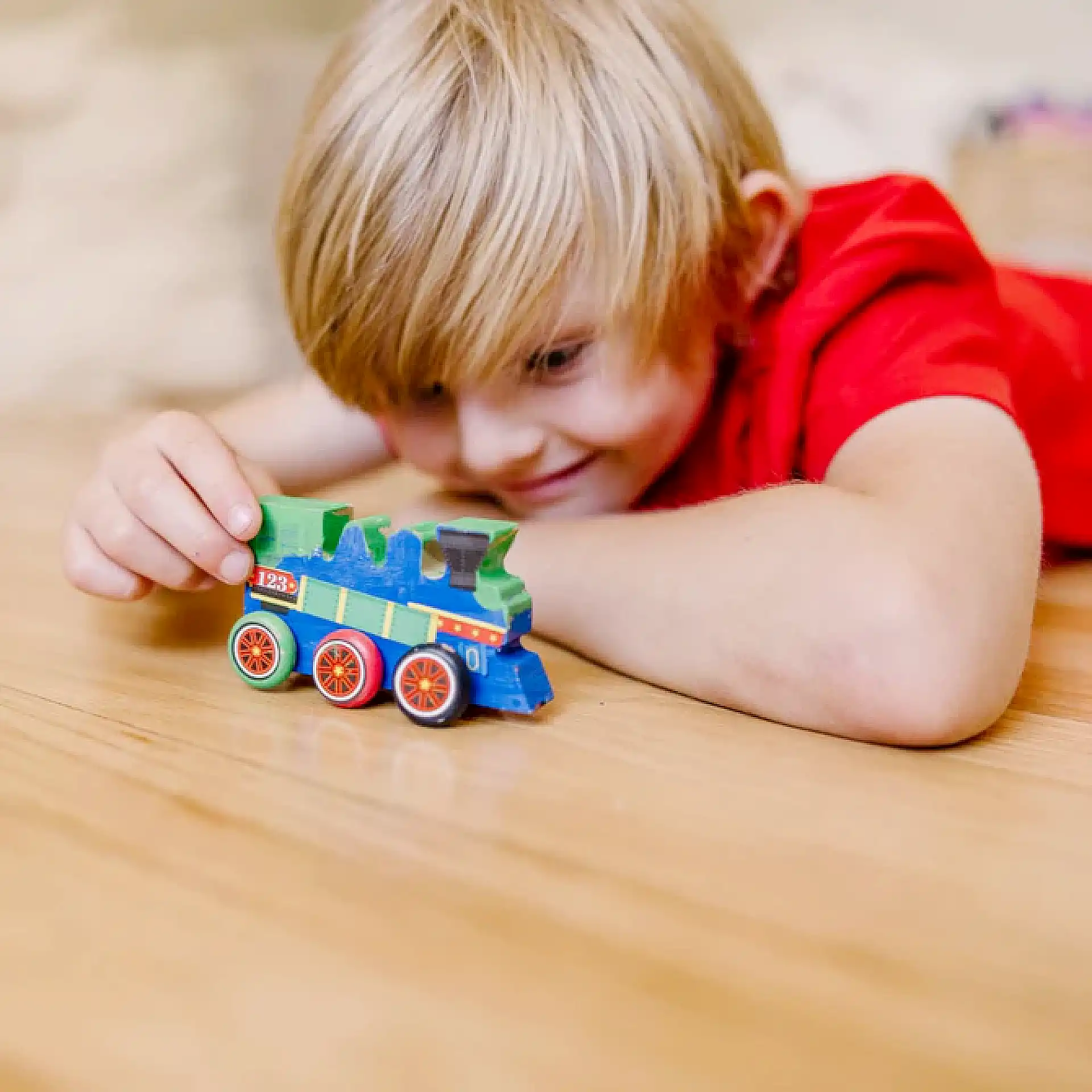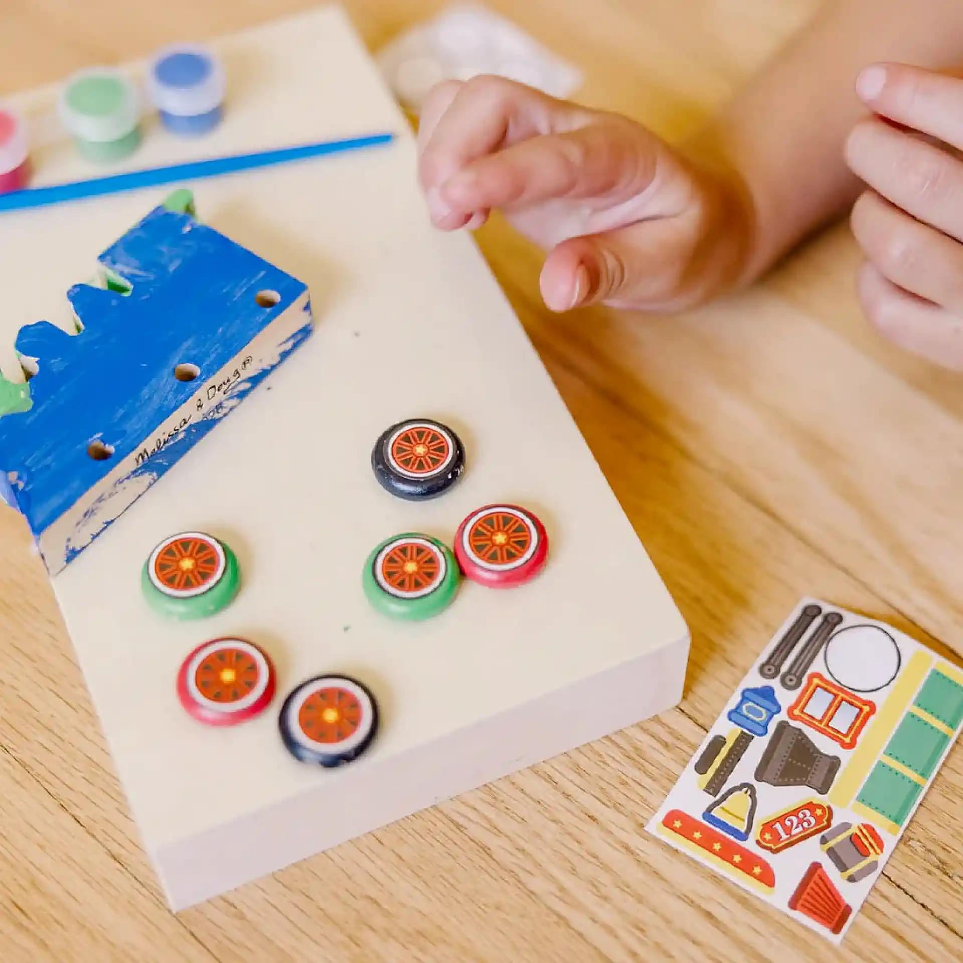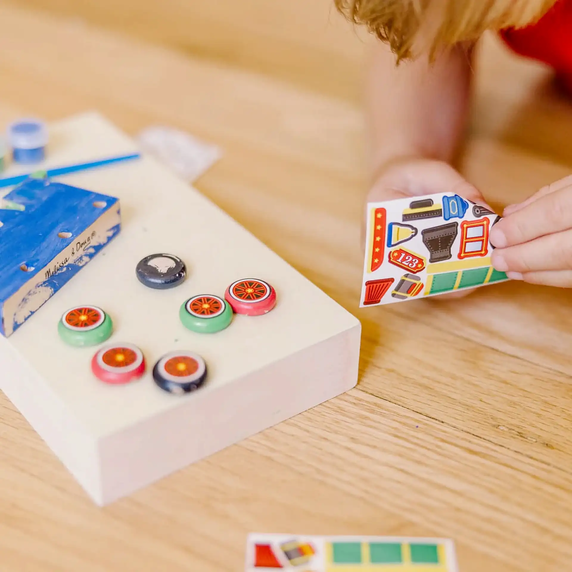 مع طقم القطار الخشبي من Melissa & Doug، الطفل مش بس بلعب — هو ببني، بيلصق، وبيلوّن ليصنع قطاره الخاص من البداية للنهاية!
