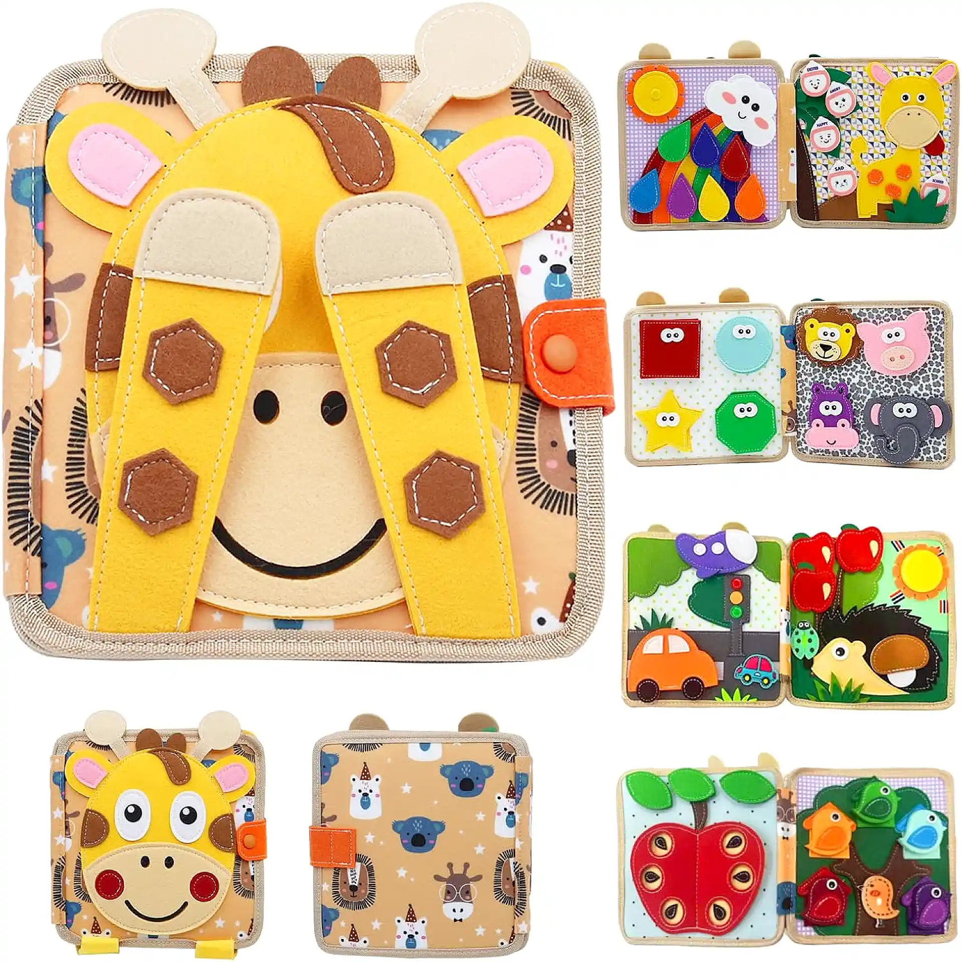 كتاب مونتيسوري التفاعلي هو كتاب قماشي مليء بالأنشطة الحسية المصممة خصيصًا لتنمية مهارات الطفل بطريقة ممتعة وآمنة. كل صفحة تحتوي نشاطًا مختلفًا يساعد الطفل على الاستكشاف، اللمس، والتجربة.
