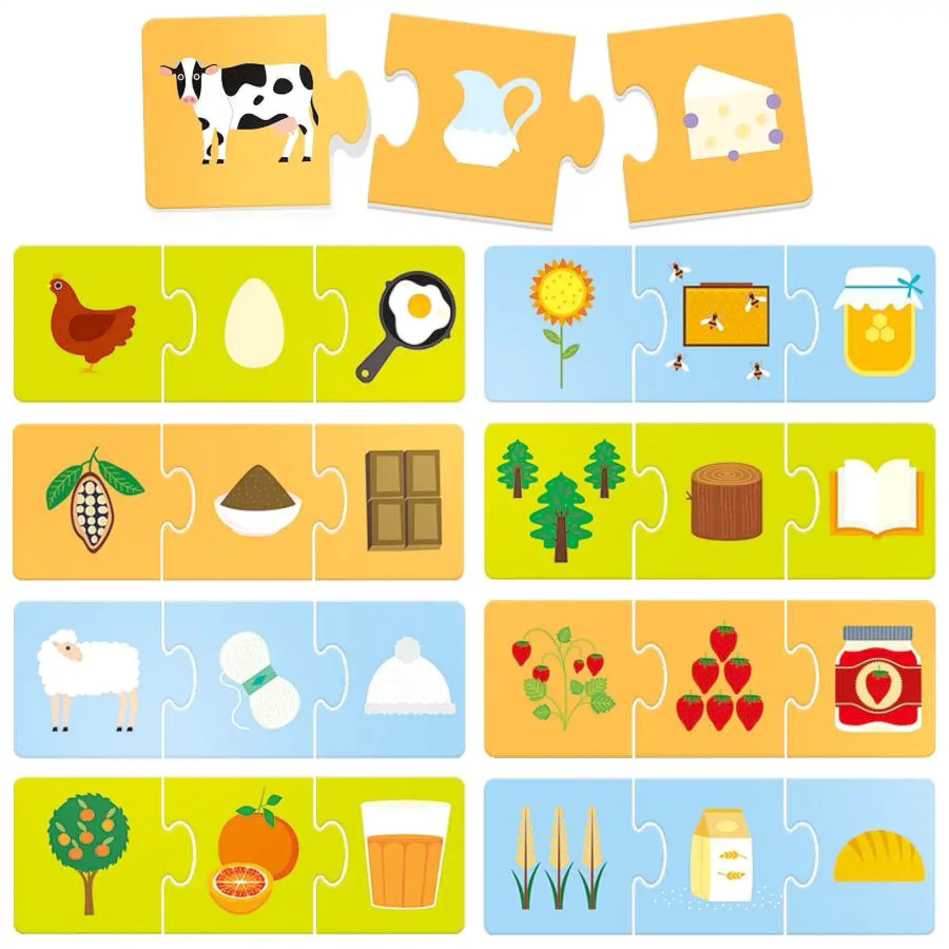 اللعبة تعتمد على تركيب ثلاثيات (3 قطع) لربط المنتج بمصدره بطريقة مبسطة وممتعة