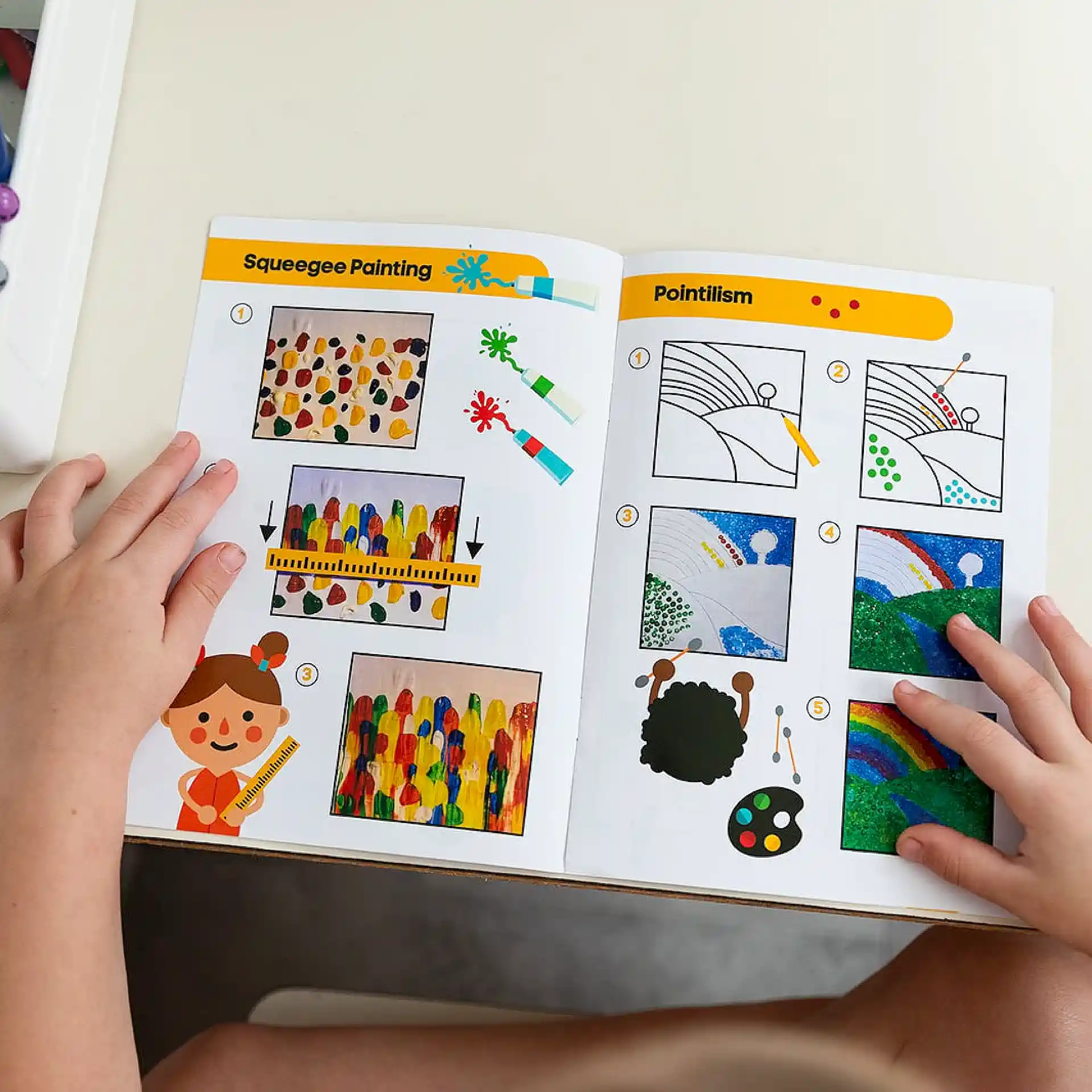 💡 يأتي المنتج مع كتيّب إلهام يحتوي على 14 تقنية رسم متنوعة، ليشجّع الطفل على الإبداع والتجربة بأساليب جديدة.