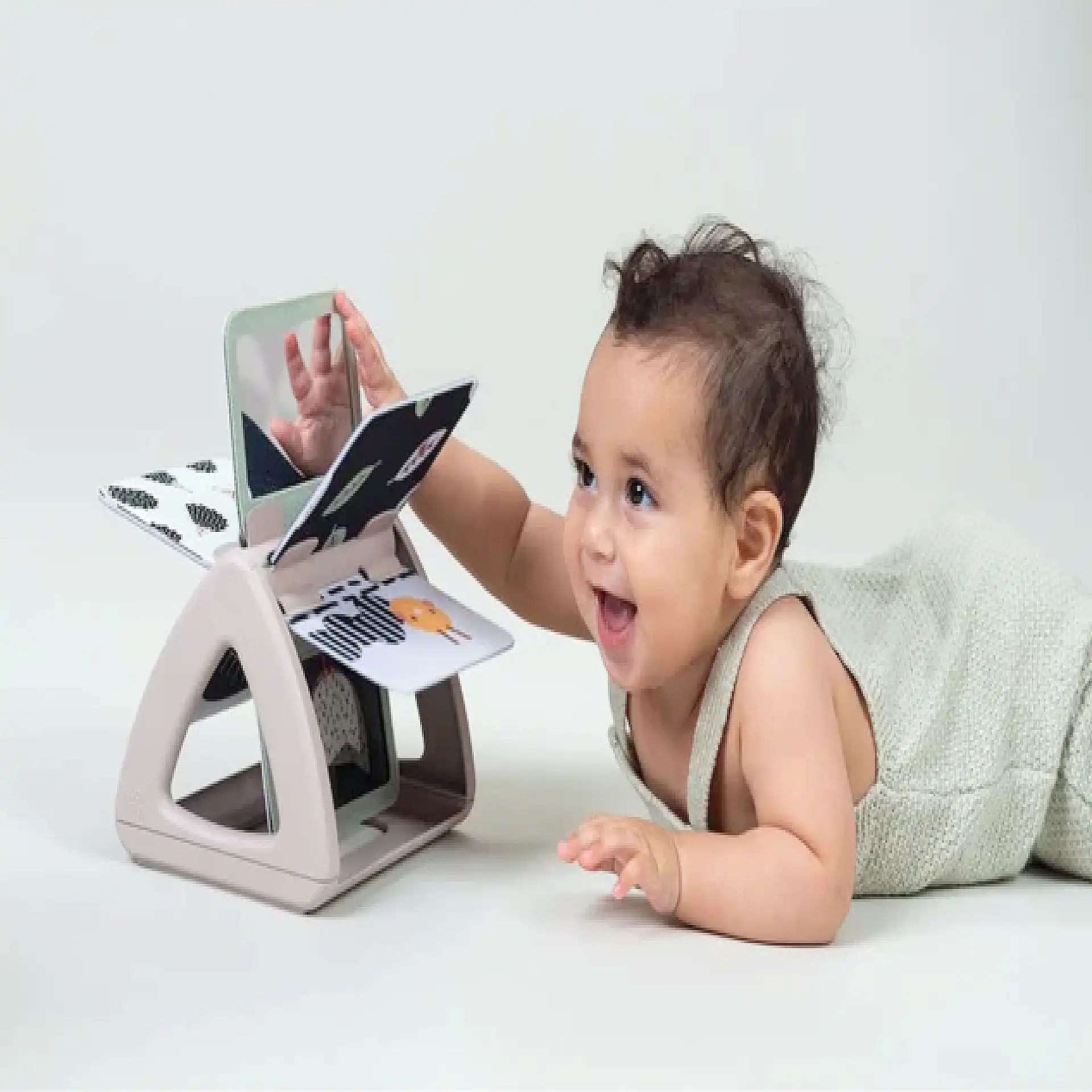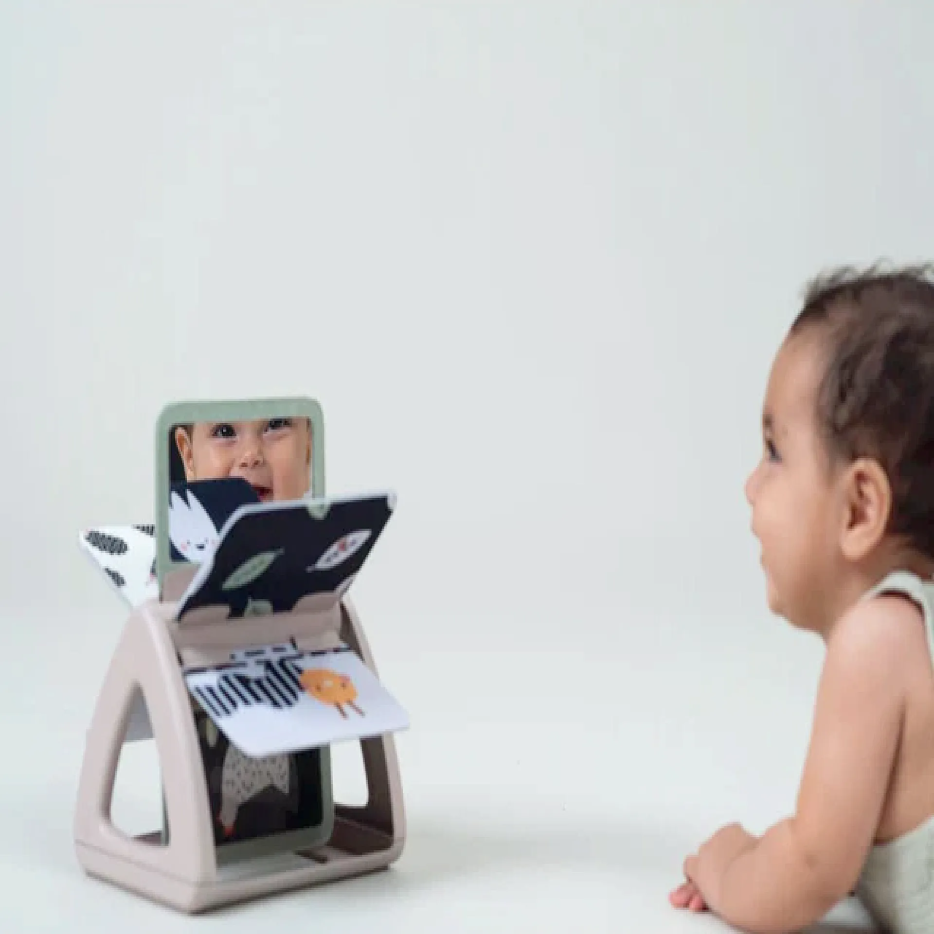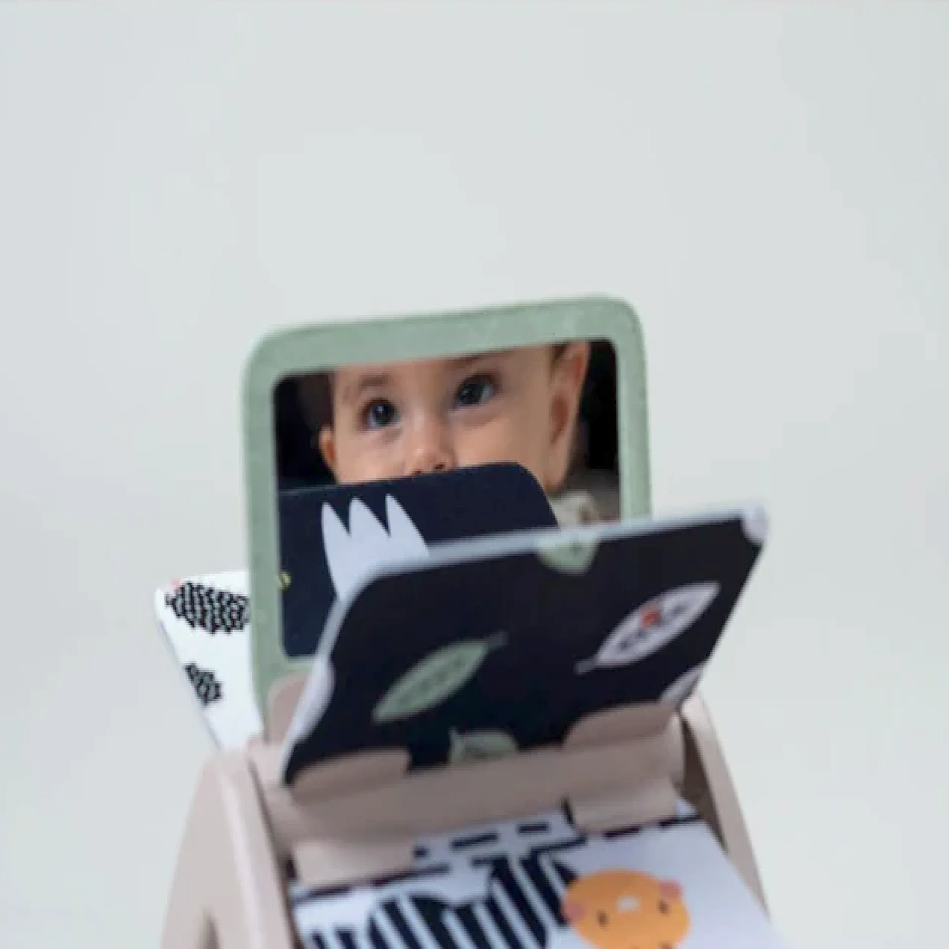 يمكن للطفل مشاهدة الرسومات العالية التباين، أو تدوير الصفحات للاستماع إلى صوت الخشخشة اللطيف، مما يمنحه تجربة لعب متعددة الحواس. كما يحتوي الكتاب على مرآة آمنة للطفل وصفحة هولوغرام لامعة تشجّع الفضول والاكتشاف.