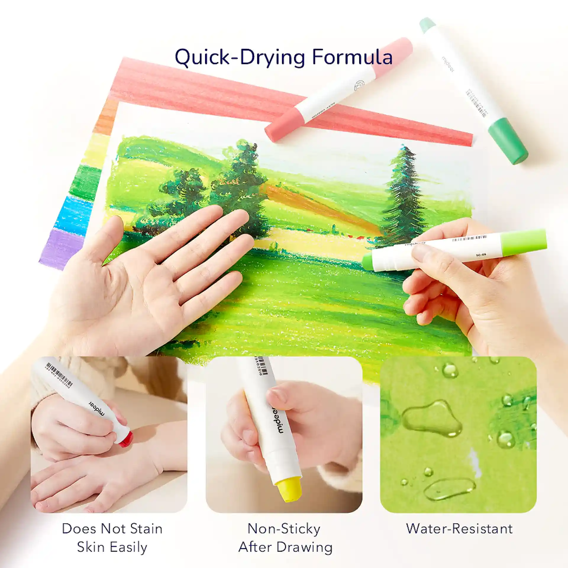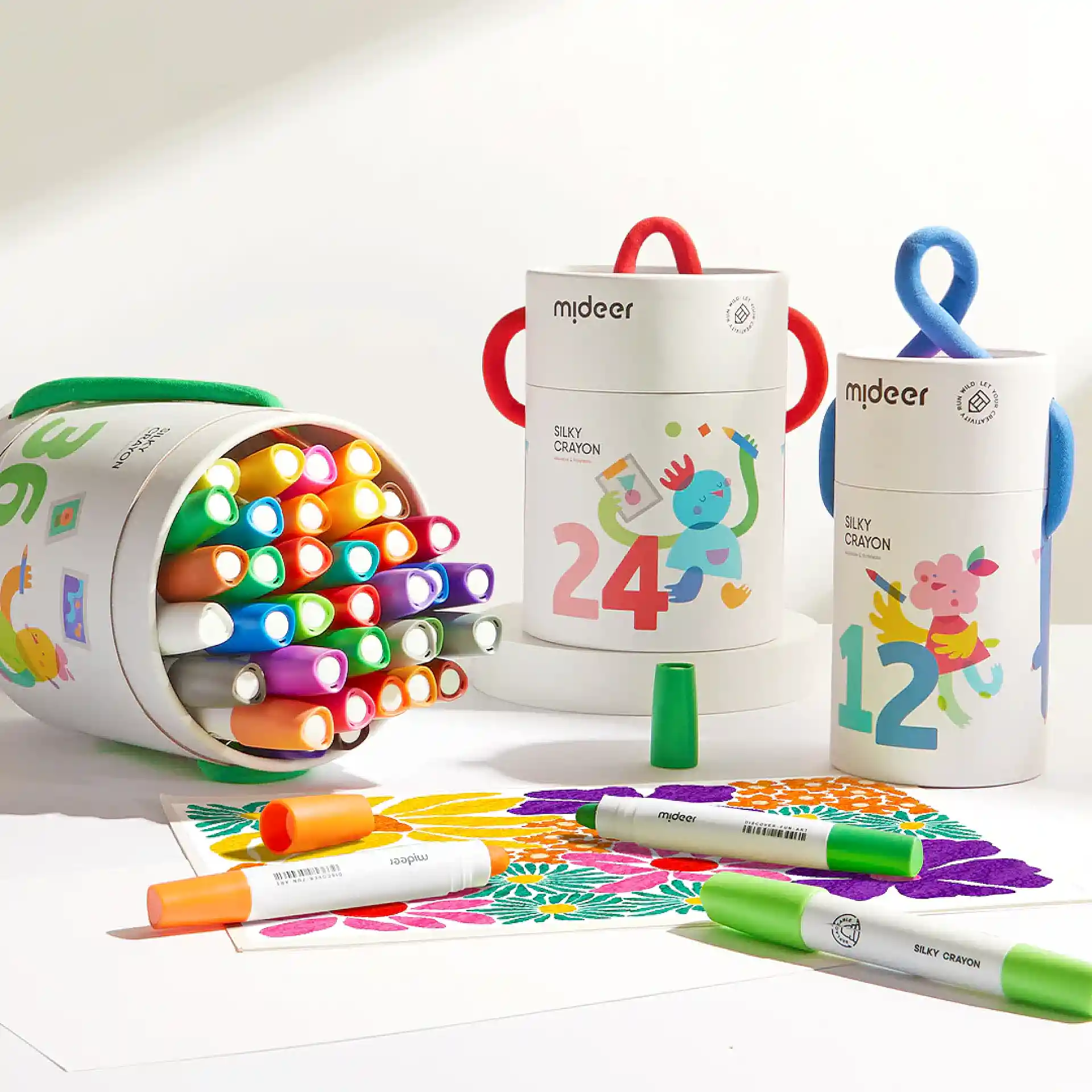 צבעי Silky Crayon מבית Mideer רכים וחלקים במיוחד, ומאפשרים צביעה קלה ונוחה ללא צורך בלחץ.