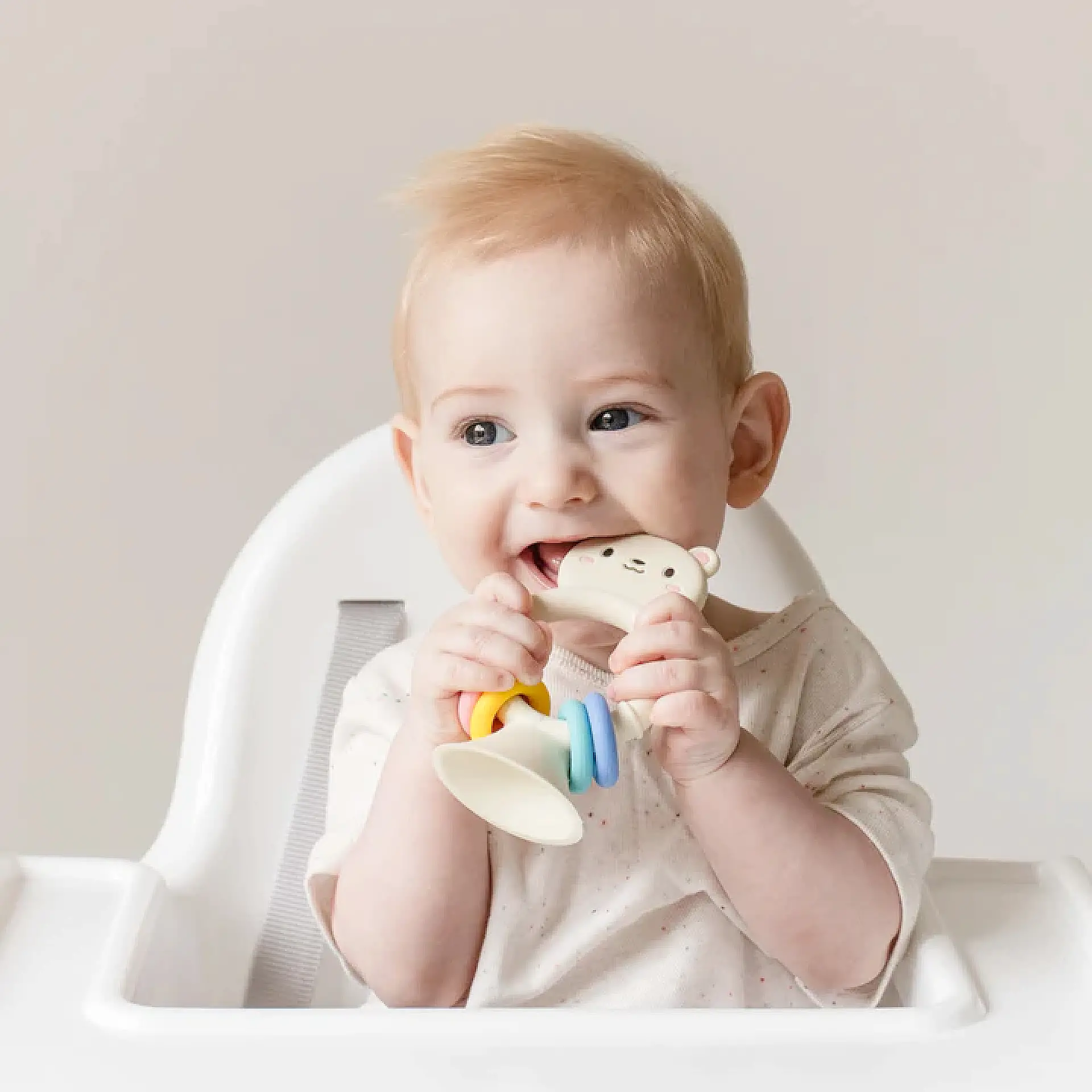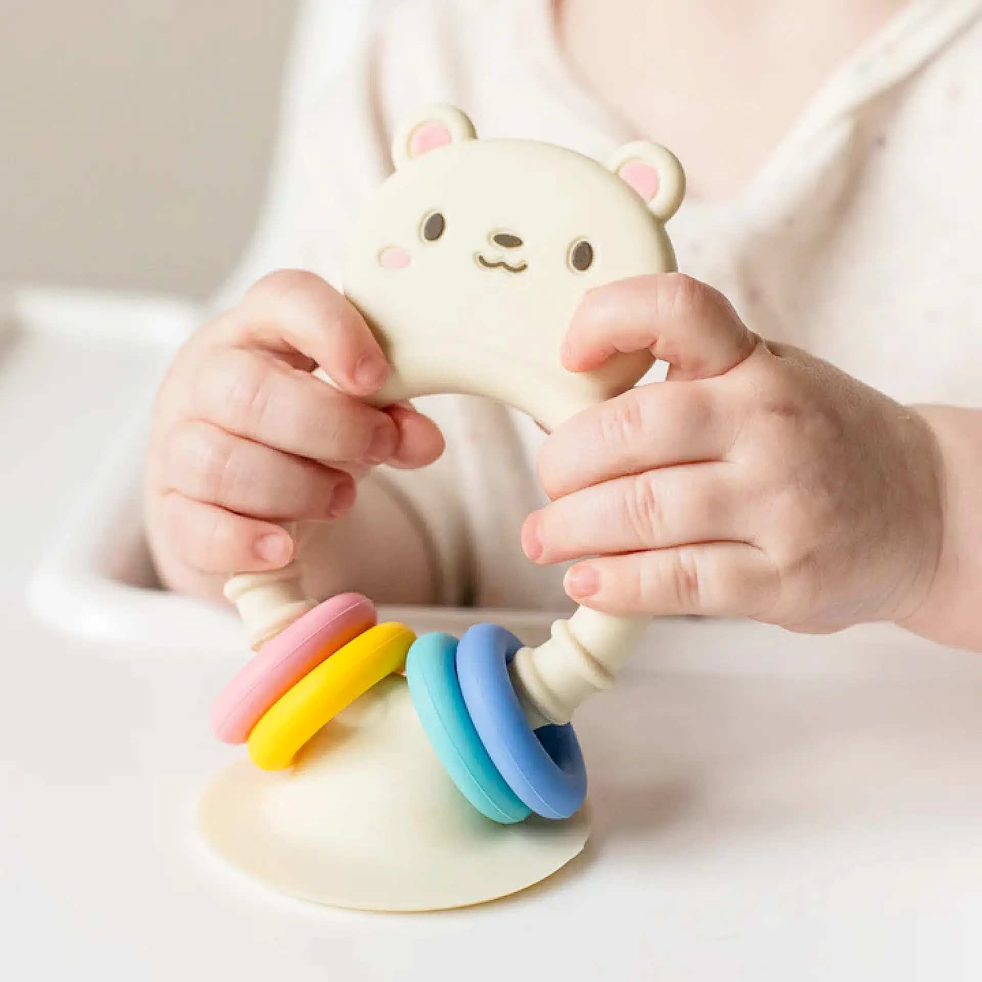 הדובי עשוי סיליקון ונצמד למשטח, והילד יכול לגעת, ללחוץ ולחקור ✨