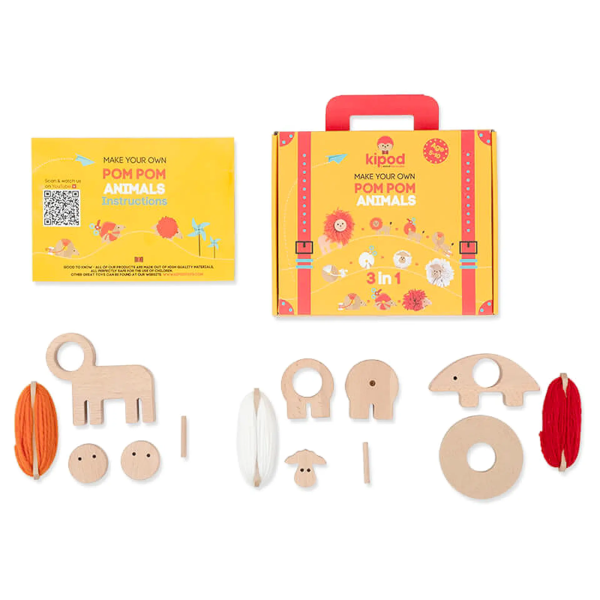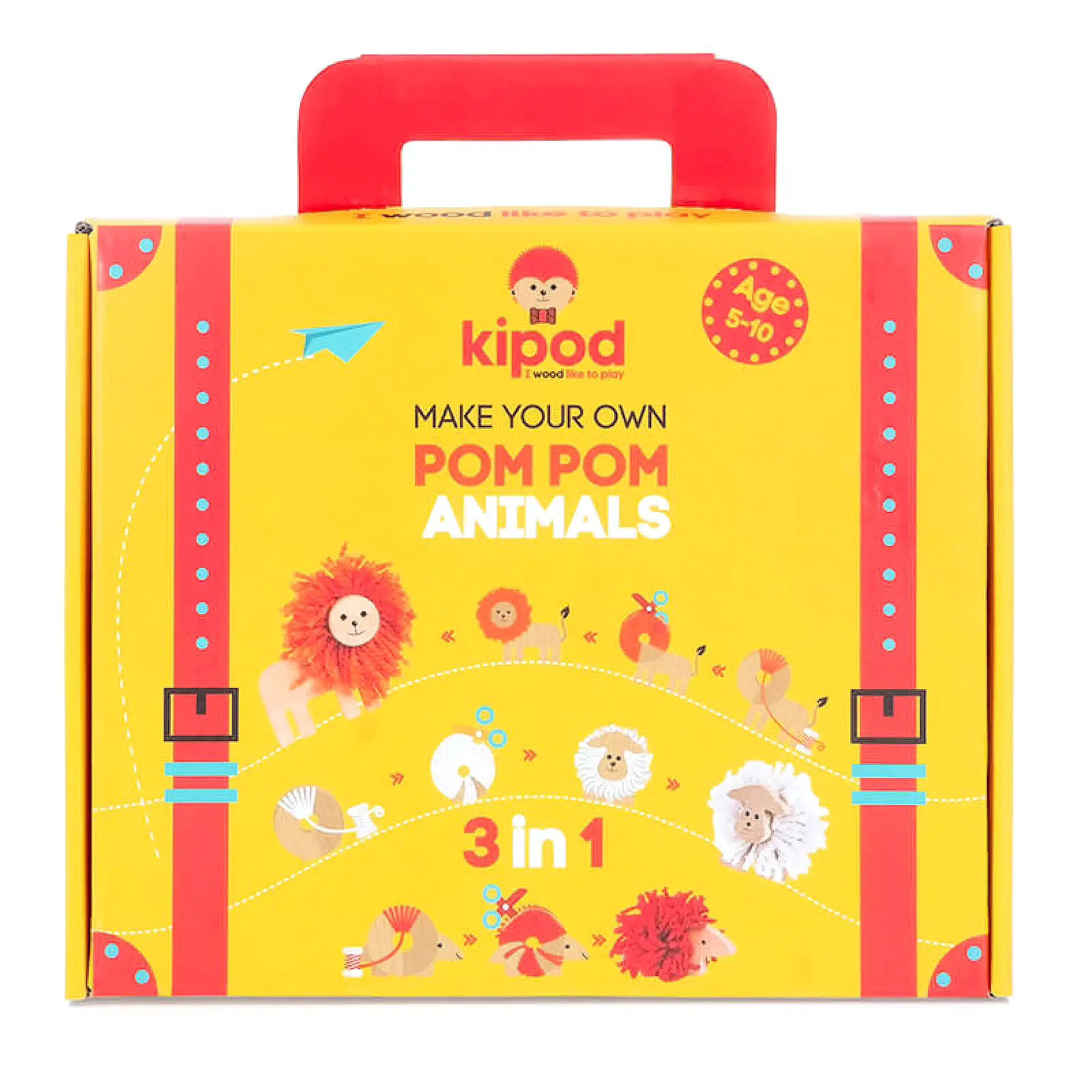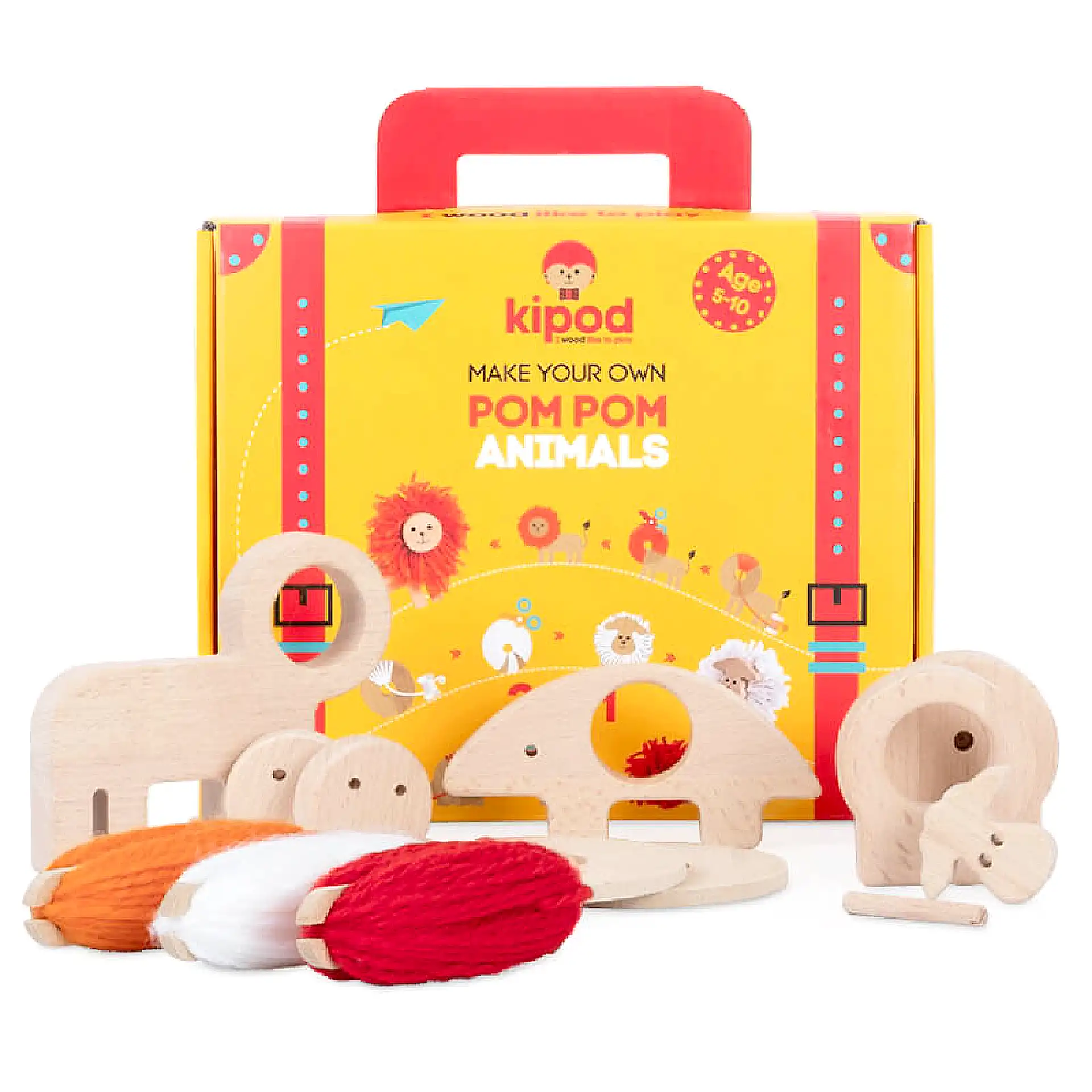 המארז כולל ערכת יצירה להכנת חיות פונפון מתוקות בשילוב עץ מלא וצמר רך: אריה, קיפוד וכבשה.