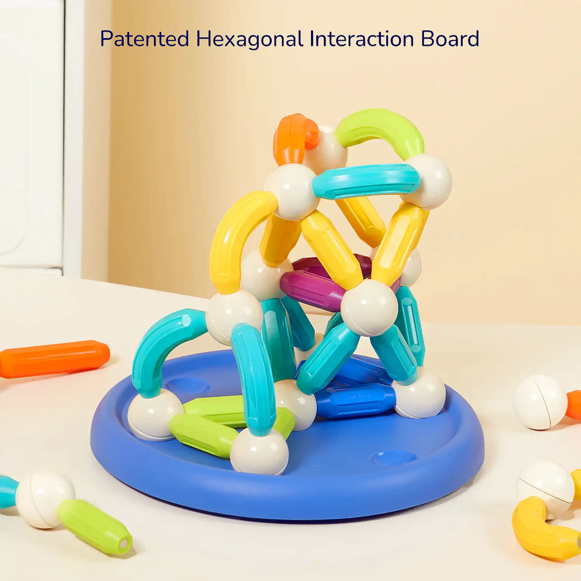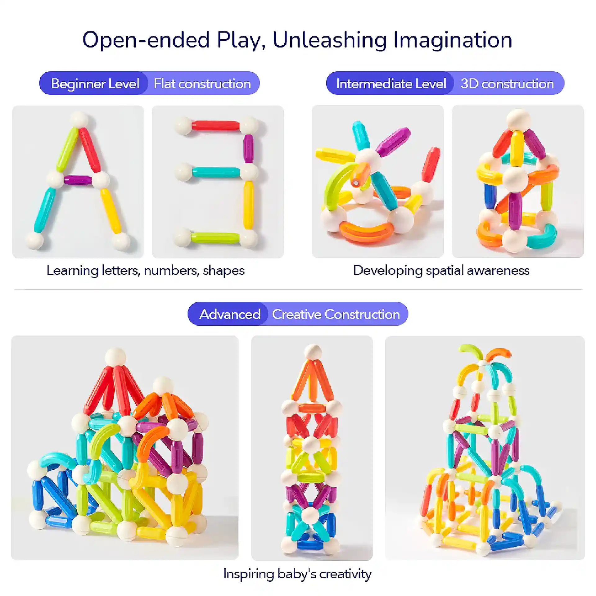 החלקים מתחברים בעזרת מגנטים ויכולים להסתובב 360°, מה שמאפשר יצירה חופשית ומגוונת