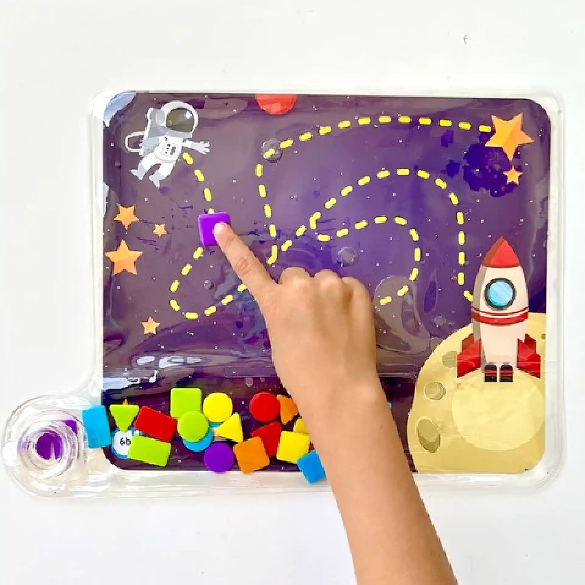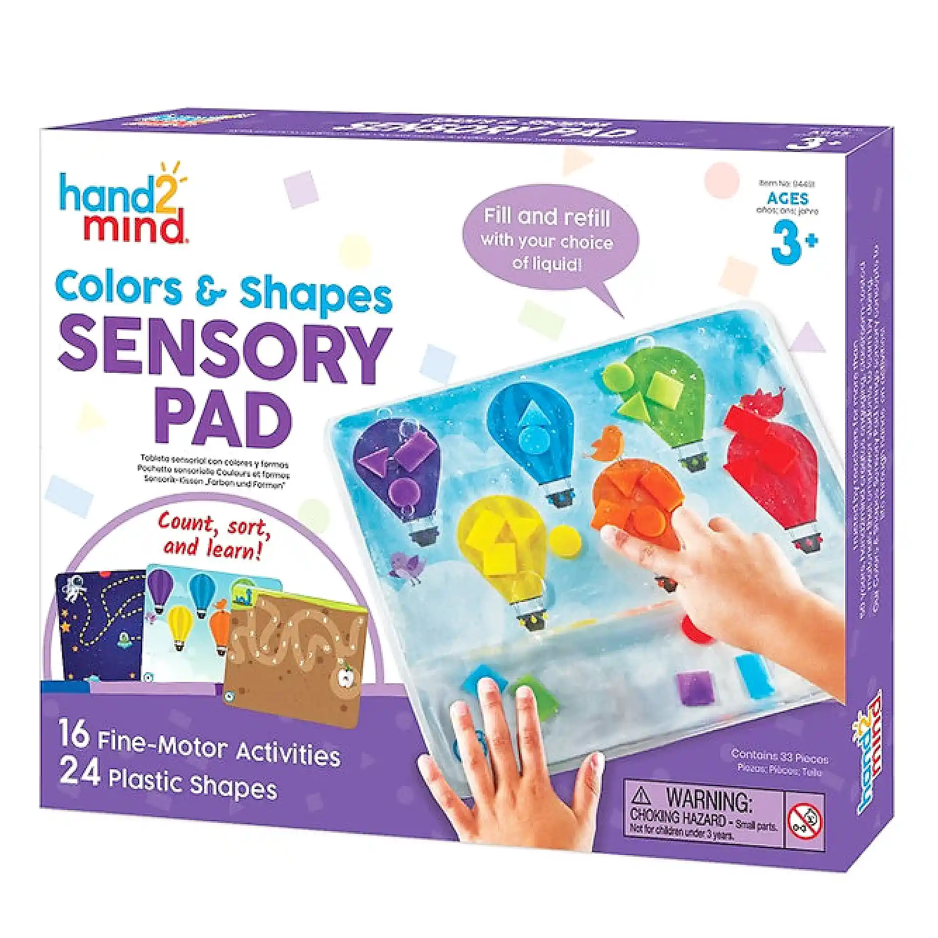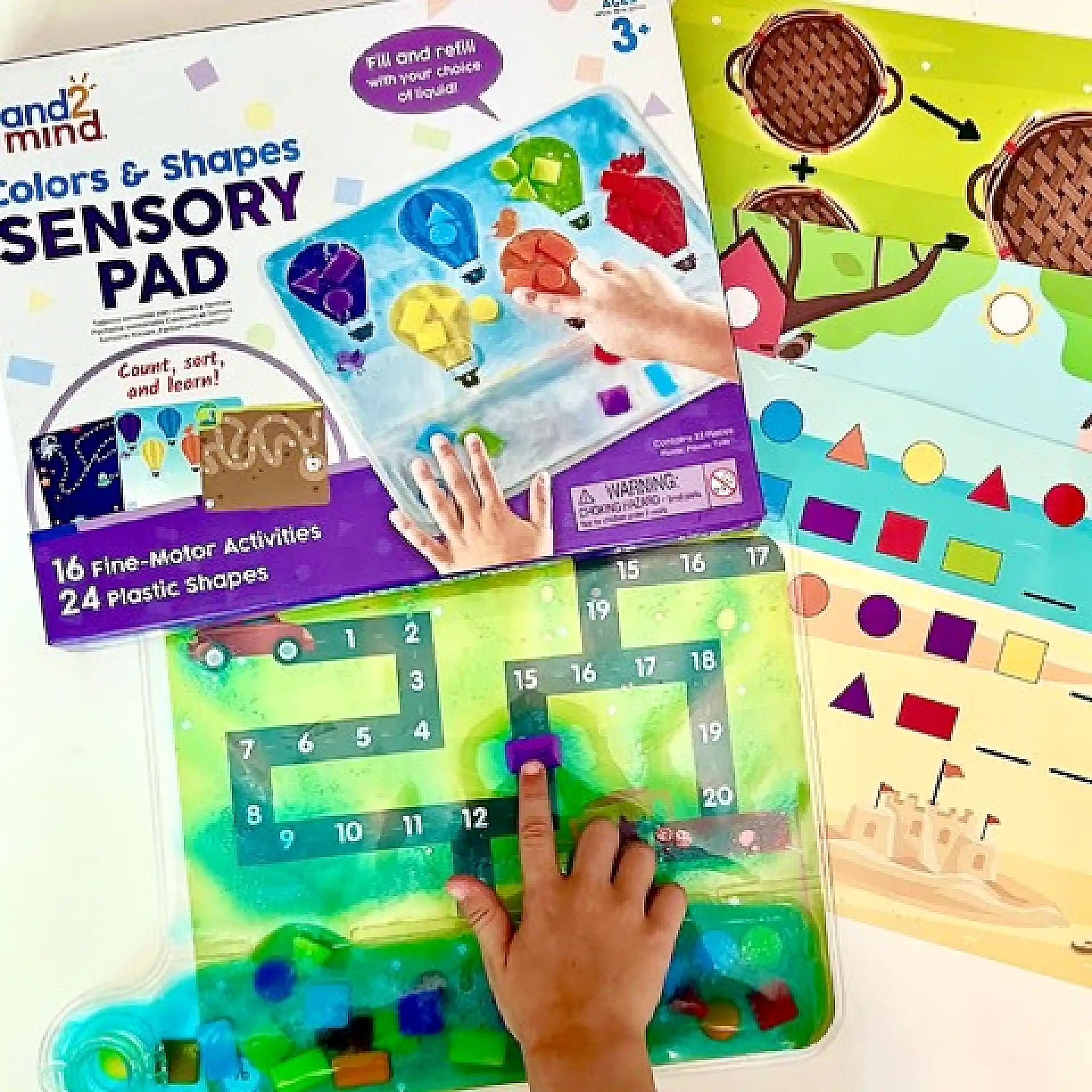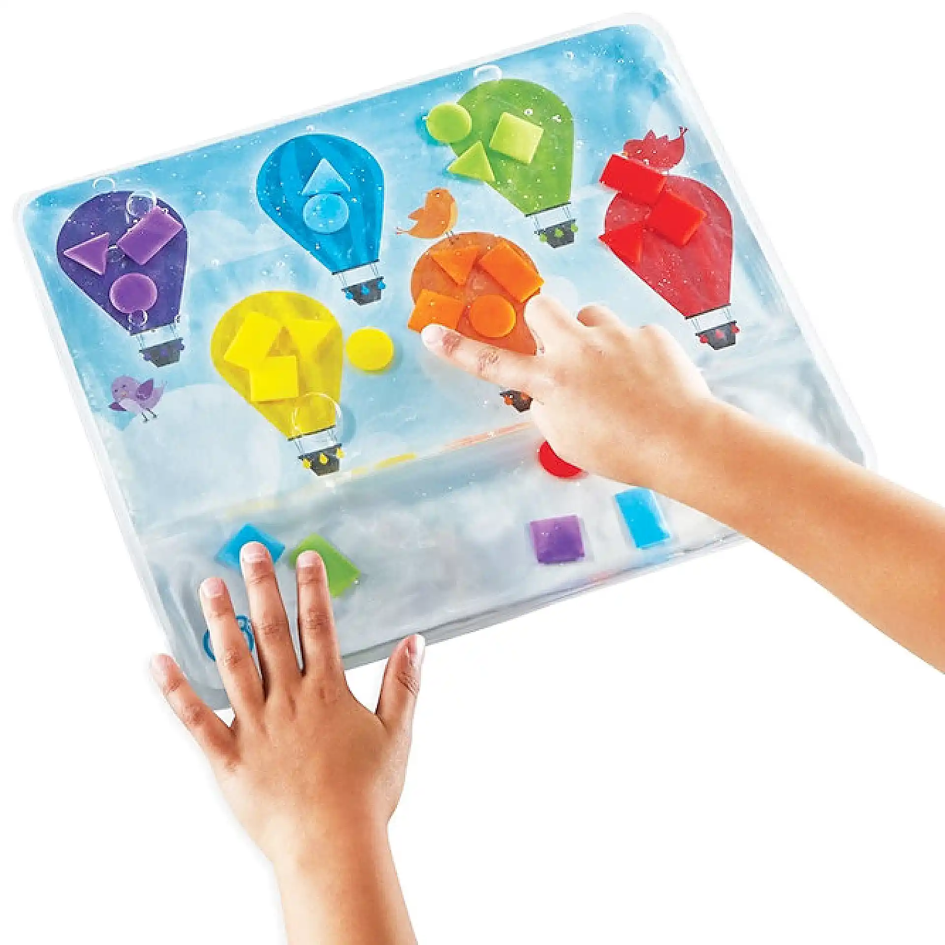 Colours & Shapes Sensory Pad הוא משטח חושי למילוי חוזר, שבו ממלאים נוזל והילדים מזיזים צורות צבעוניות בעזרת הידיים.