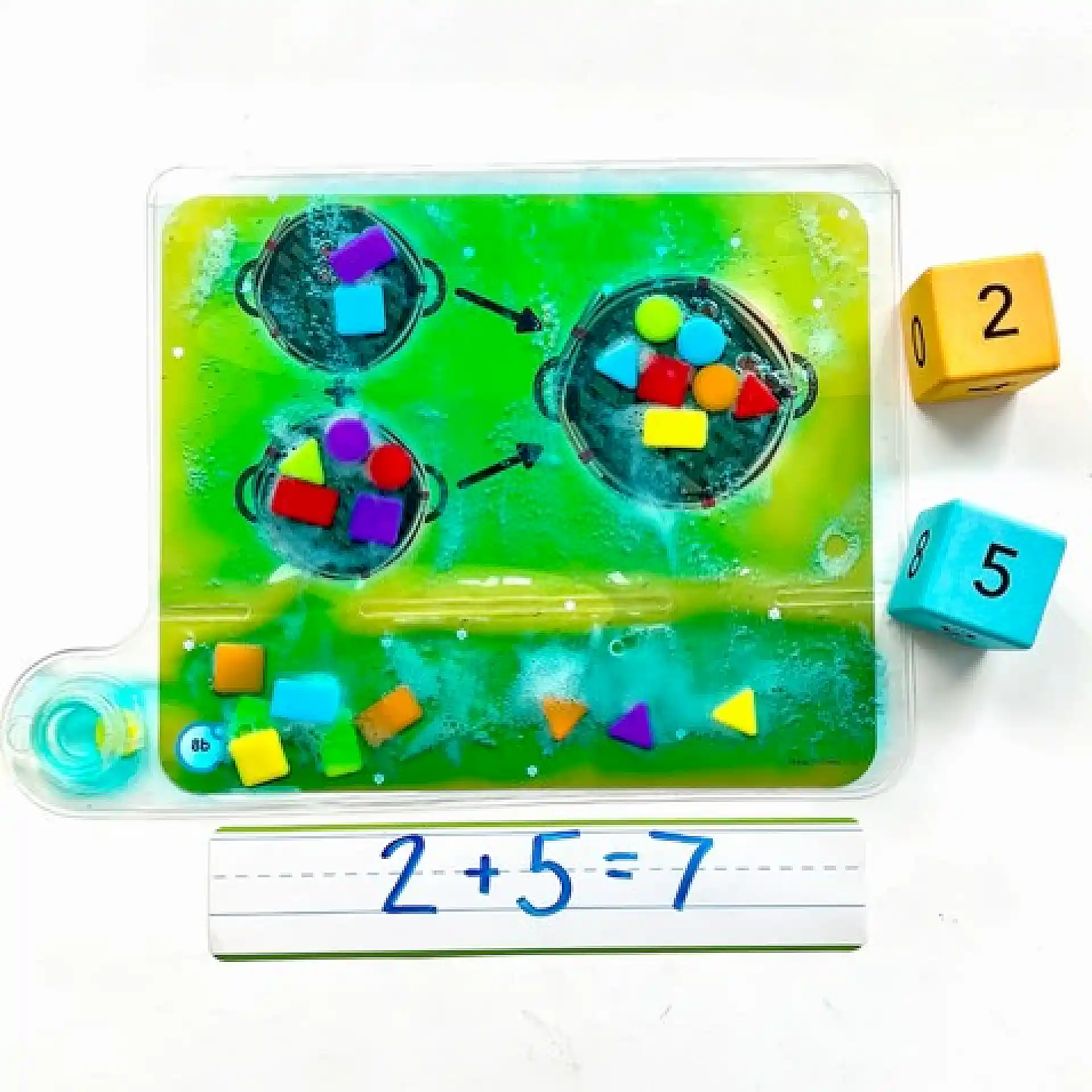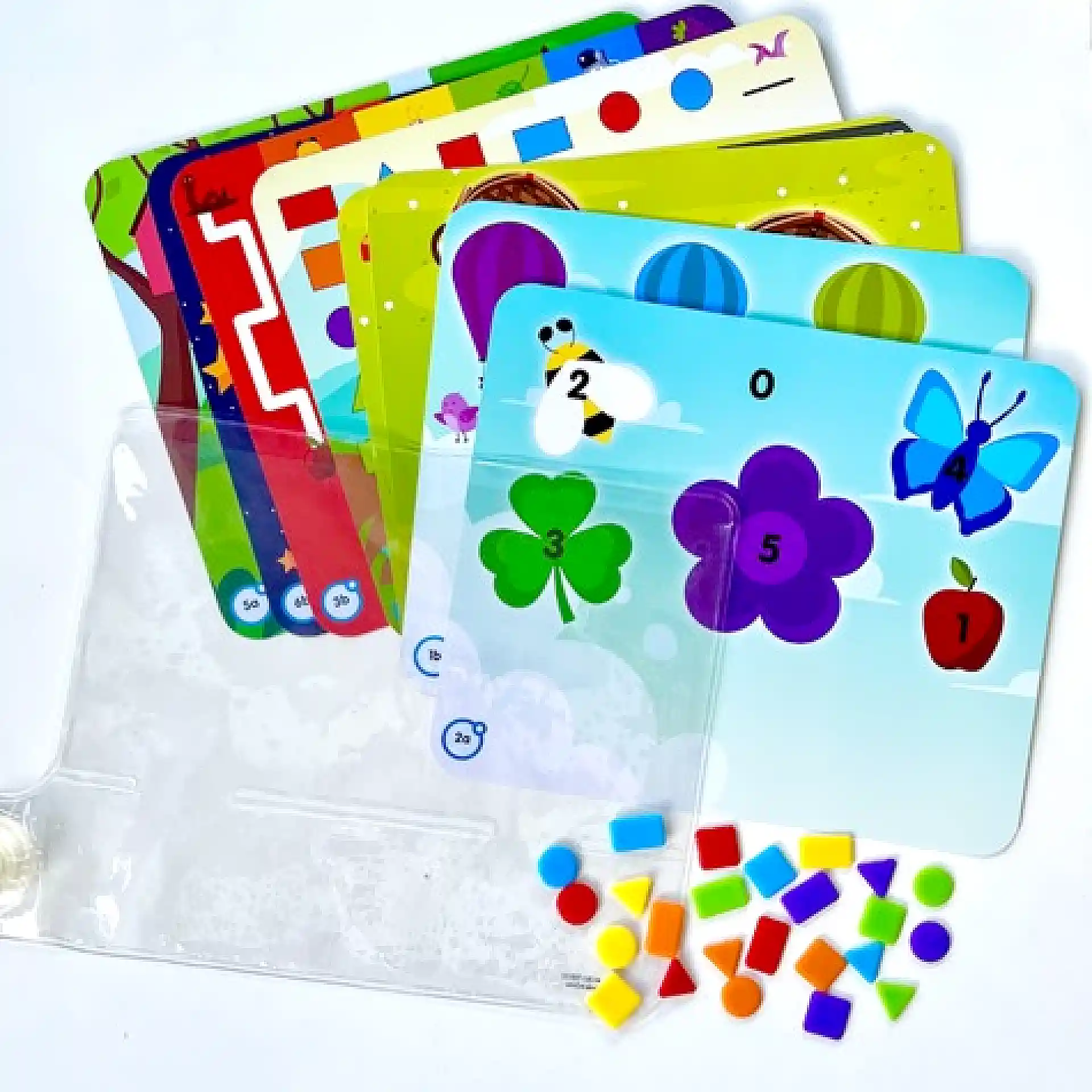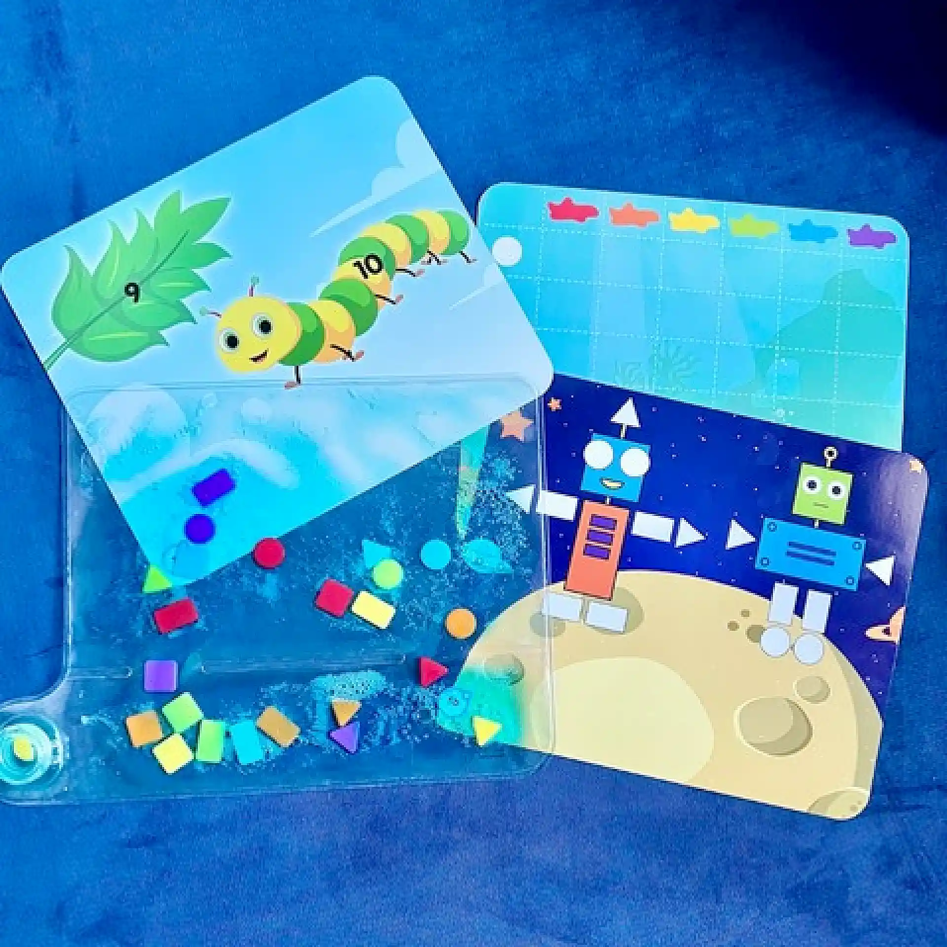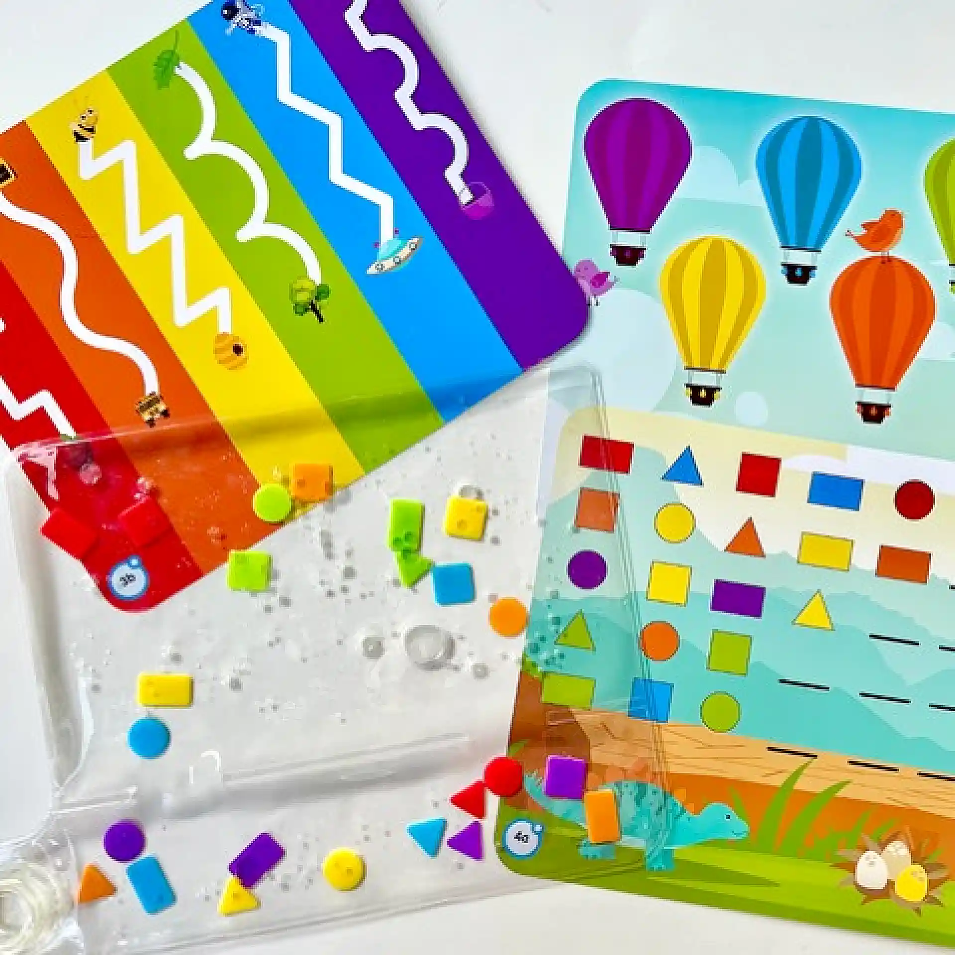 Colours & Shapes Sensory Pad הוא משטח חושי למילוי חוזר, שבו ממלאים נוזל והילדים מזיזים צורות צבעוניות בעזרת הידיים.