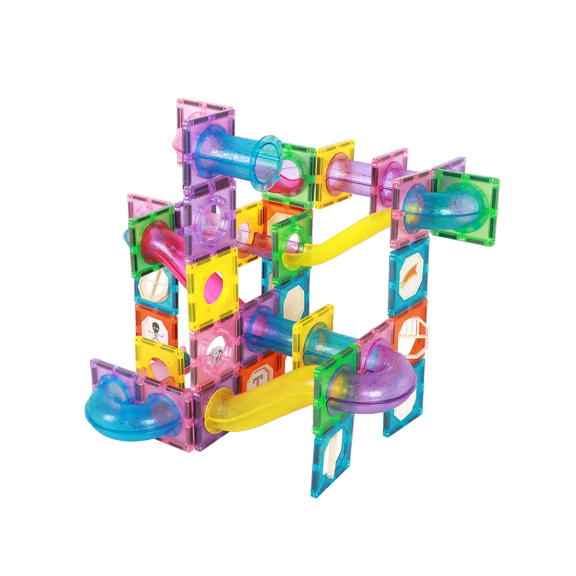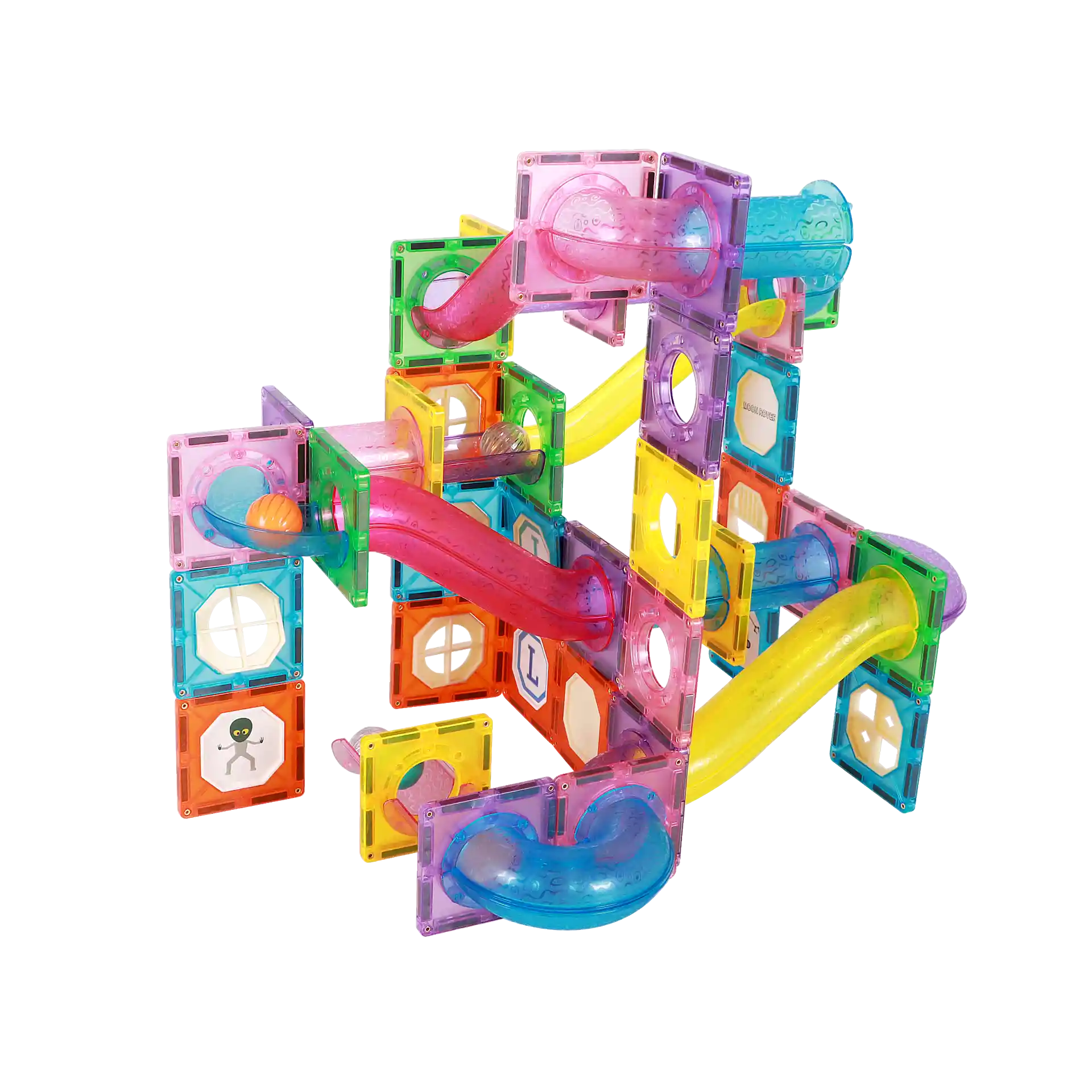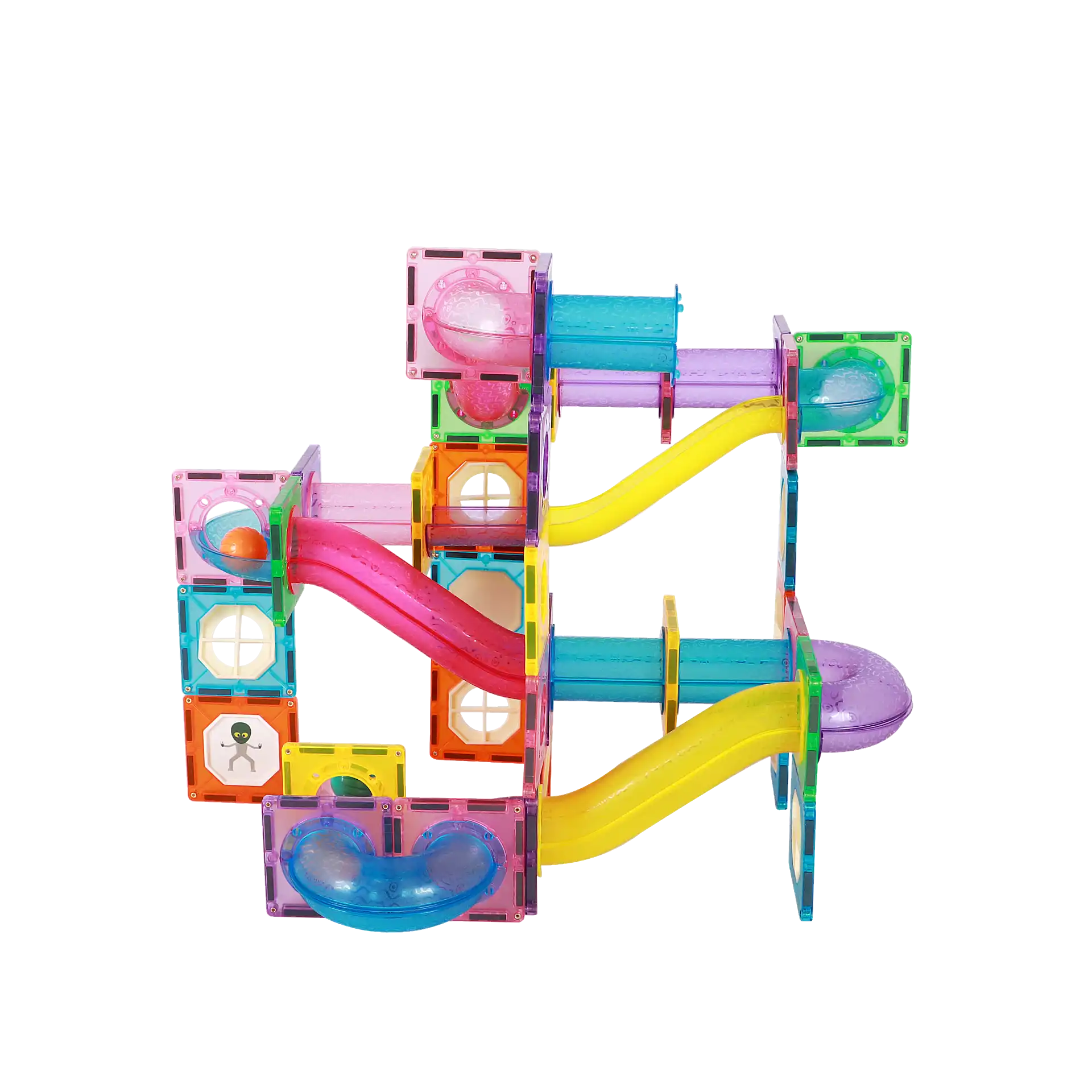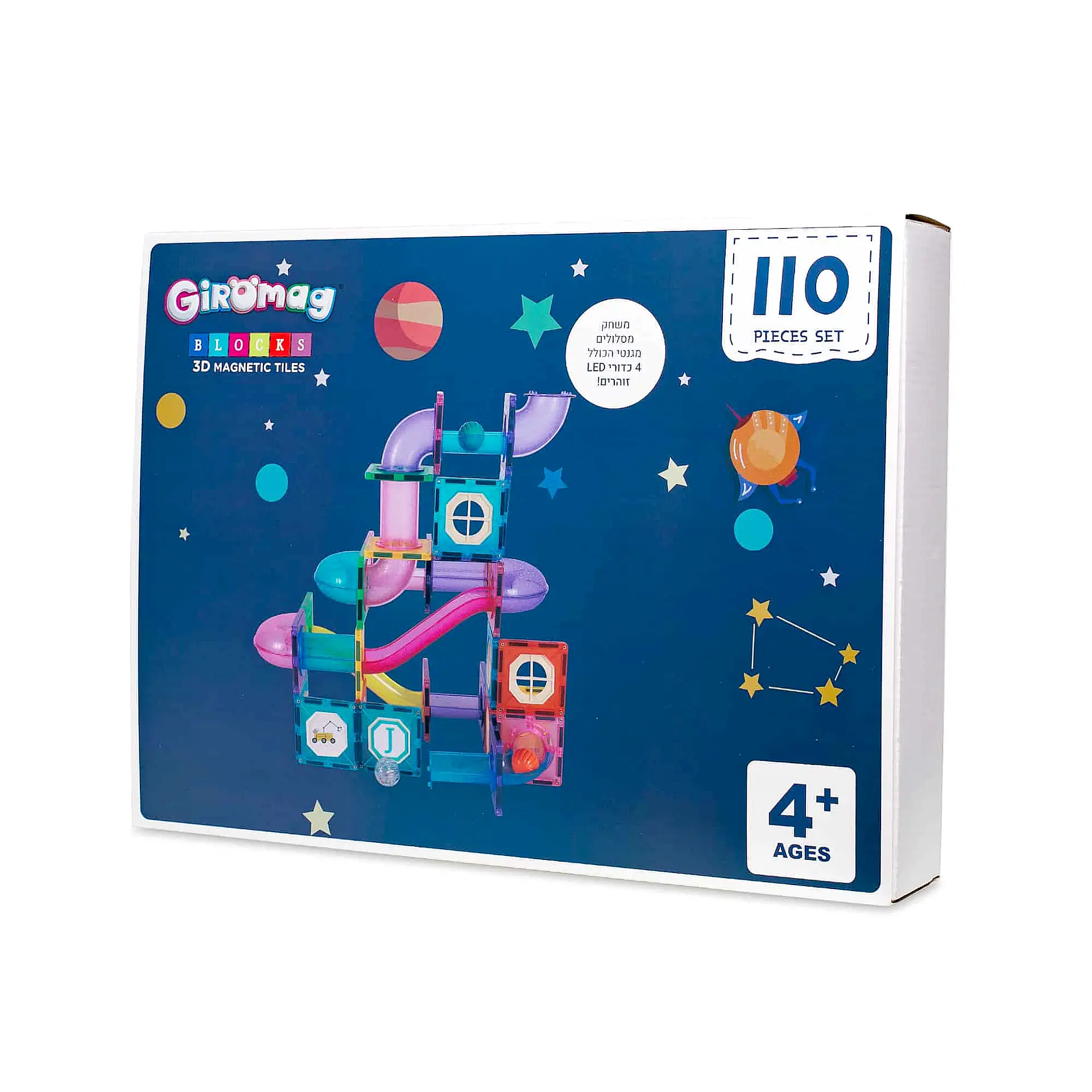 הערכה כוללת חלקים מגנטיים וצינורות המאפשרים לבנות אינסוף מסלולים, יחד עם 4 כדורים (מתוכם 2 כדורי LED זוהרים) שמוסיפים עניין וחוויה ויזואלית מיוחדת ✨